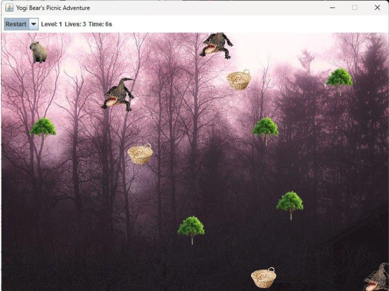 This project was done in Apache NetBeans for Programming Technology class. The goal is to guide the capybara through the forest to gather baskets and avoid crocodiles. It features 10 randomly generated levels and 3 base player health. When the game ends, the player has the option to write their name and save their score in the database (JDBC), however only top 10 scores are displayed (based on speed & difficulty achieved within a round).
