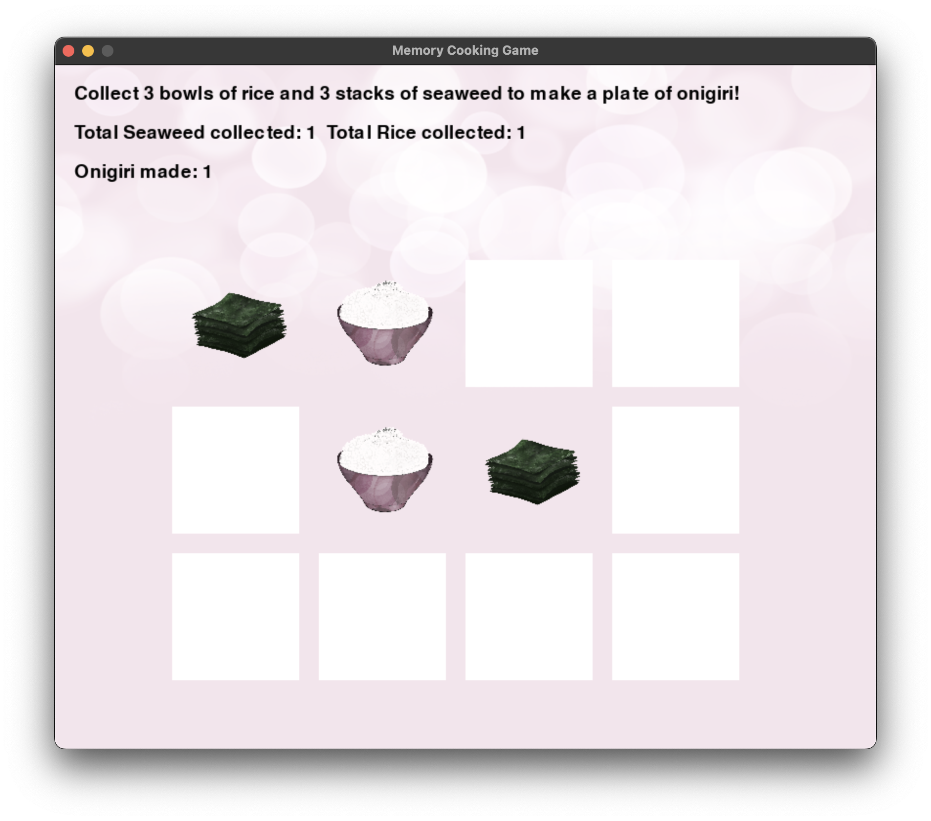 This game was made in my Python elective class as an assignment. It is a very simple picture matching game, where the objective is to match 3 seaweeds and 3 rice bowls to make an Onigiri dish. I have drawn all the assets using Procreate. Currently, I am adding more complexity to the game as I want to expand this assignment into a personal project to learn Python and Pygame in better depth.
