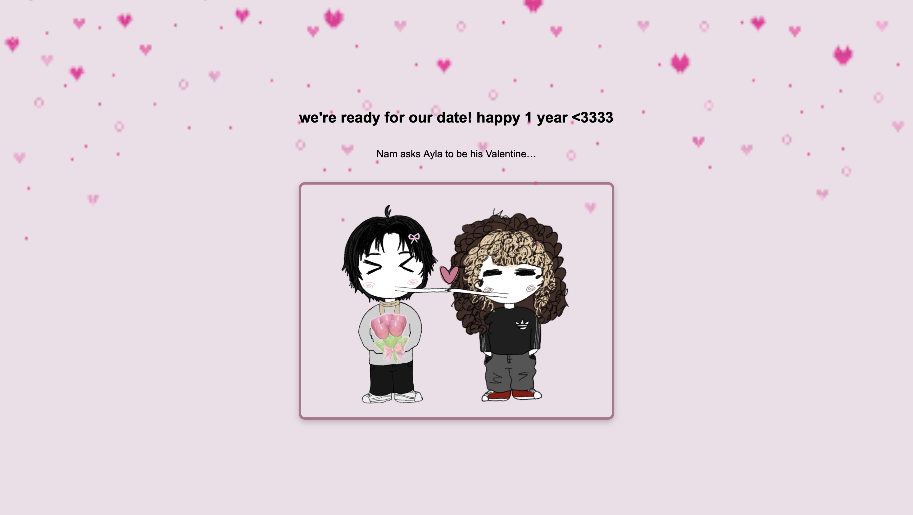 This simple game was made as a Valentines day gift to my boyfriend. It is just a small one day project through which I wanted to showcase that coding and creating can be fun and my coursework knowledge can be utilized for personal stuff/fun!