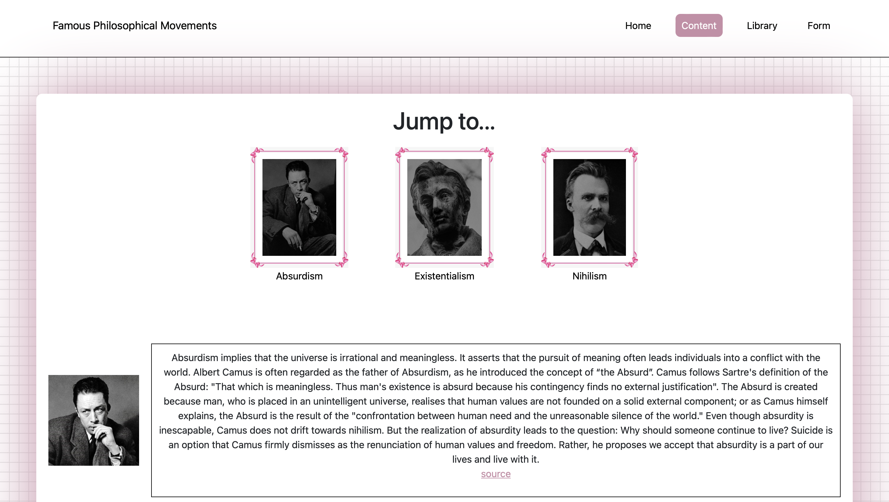 This website was made as an assignment during the Web Developement course where we learned the basics of Web design and accessibility. It is one of my first creatively free projects that sparked my interest in front-end developement. It showcases my love for Philosophy as a hobby :). Simple, but meaningful.