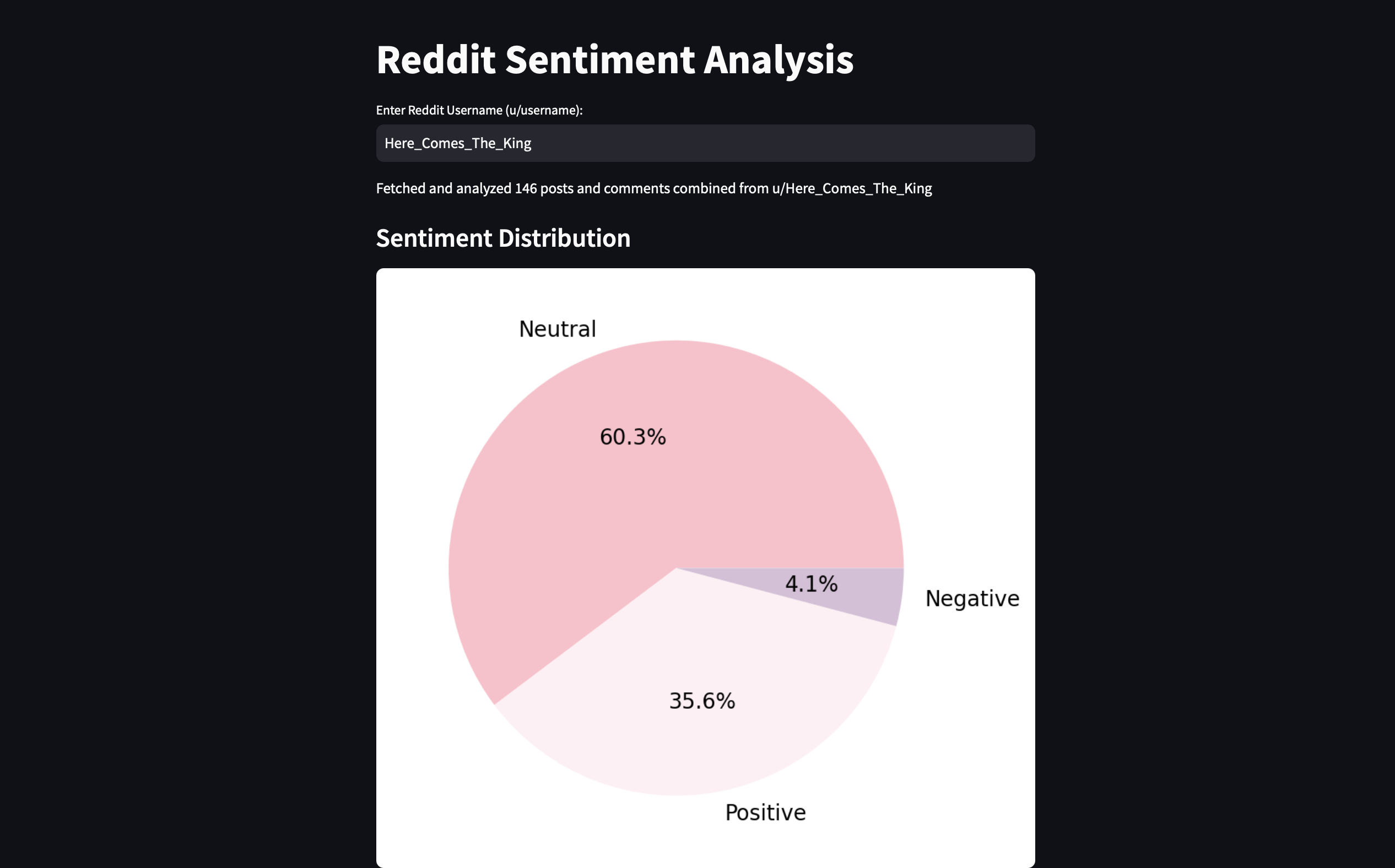 This project is a Reddit post + comment Sentiment Analysis Dashboard visualizer. It is written with python, and utilizes mutliple libraries in order to achieve the best result. With the Reddit API (specifically praw) and MySQL Workbench I created a connection to fetch and store a users data by username, specifically their post titels and comments with the links and numbers filtered out for more precise analysis. I used mathplotlib and wordcloud to display the information, and streamlit to run the app. Unfortunately it only works locally.